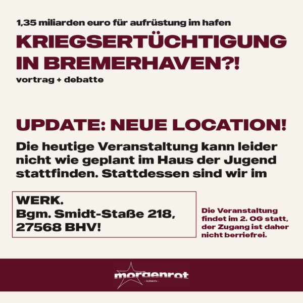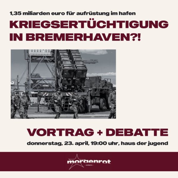 Donnerstag, 19.04, 19:00 – Vortrag + Debatte – Kriegsertüchtigung in Bremerhaven – Haus der Jugend Bremerhaven